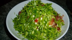 Hozzávalók : 250 g mascarpone sajt, érdemes a drágábbat venni mert intenzívebb ízekkel bír, 250 g szeletelt baconszalonna, (ebből akár többet is rakhatunk mert a felkockázás és pirítás után jócskán veszít a súlyából ) egy jó nagy csokor friss snidling.