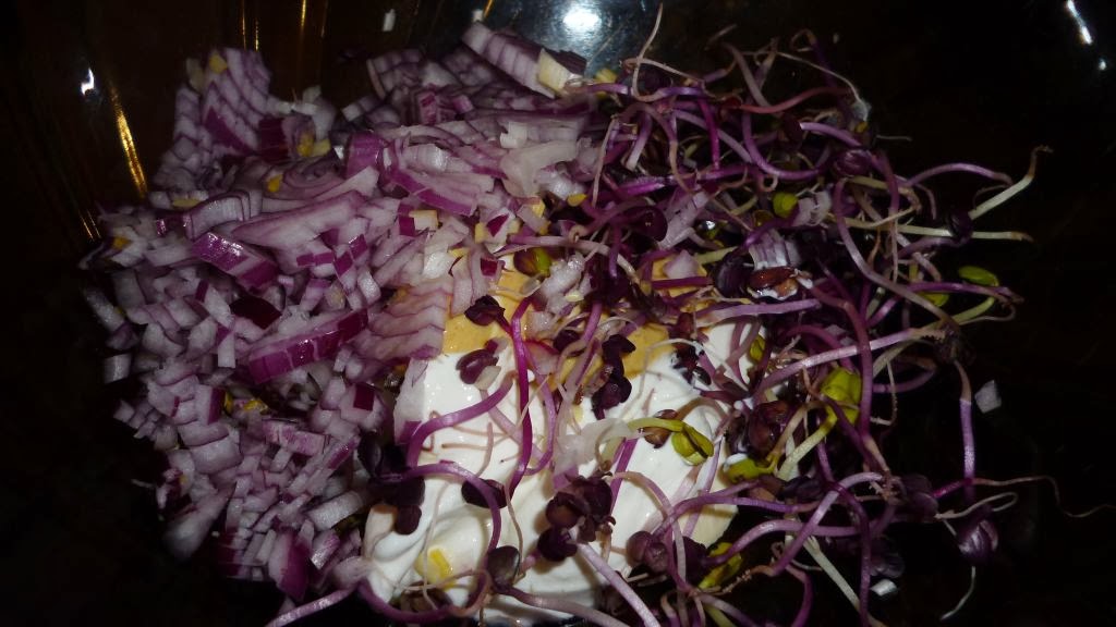 8 darab tojás, egy evőkanál puha teavaj, kettő evőkanál dijoni mustár, kettő evőkanál tejföl, egy közepes lilahagyma apróra vágva, retekcsíra, himalája só.