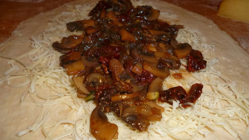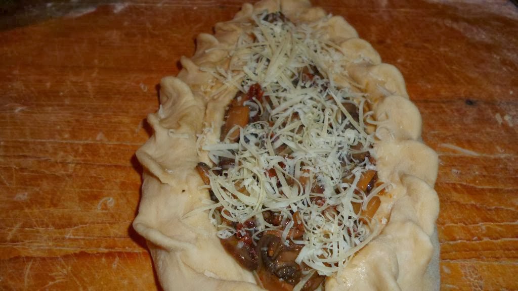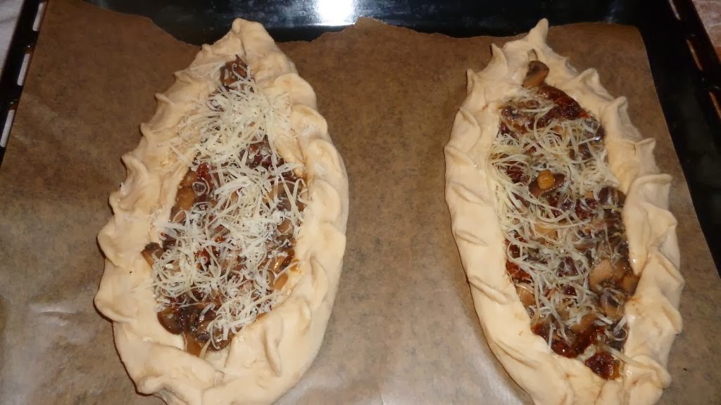A tésztát darabokra vágjuk, majd ovális alakúra nyújtjuk és reszelünk rá az előkészített parmezán sajtból majd ráhalmozzuk a kész gombát. Ezután újra megszórjuk reszelt sajttal a tetejét, majd csónak alakúra igazítjuk és megcsipkedjük a széleket.