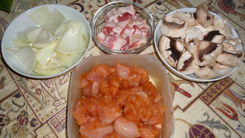 Csirkemell kockákra vágva, vöröshagyma cikkekre vágva , gombafej cikkekre vágva, szalonna felkockázva.