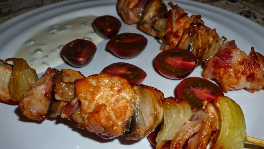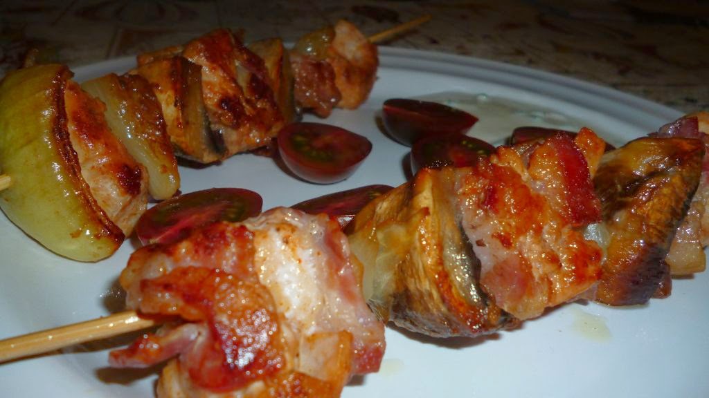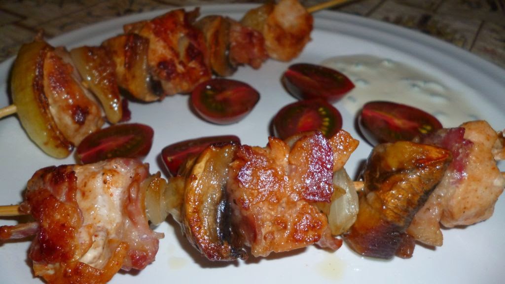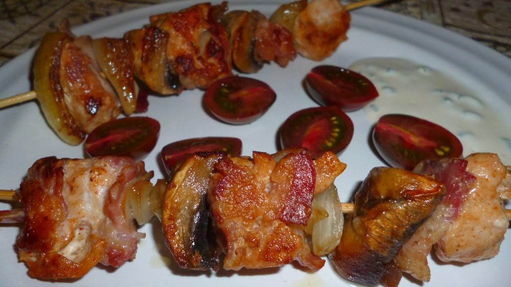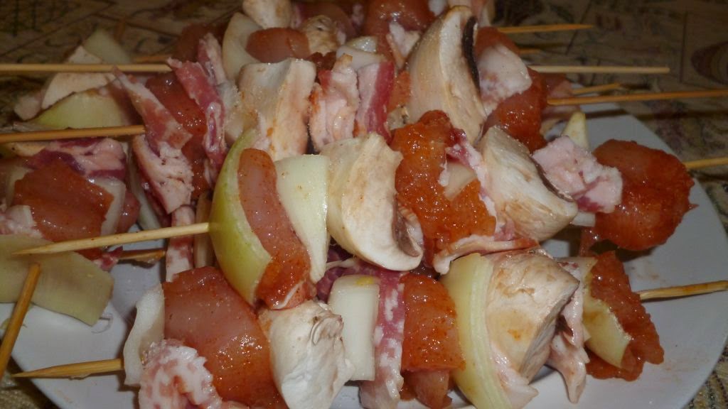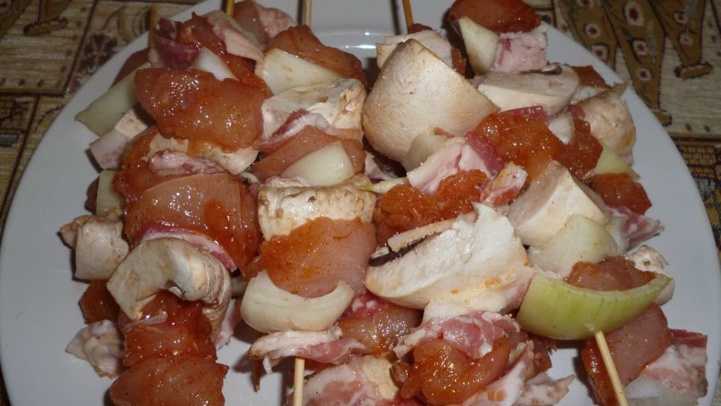 A kockára vágott csirkemellet ízlés szerint fűszersóval és fehér borssal ízesítettem, majd rövid állás után az előkészített nyársakra tetszőleges módon egymás után felszúrtam az elkészített hozzávalókat. A gombát akkor sóztam át enyhén mikor már fenn voltak a nyárson.