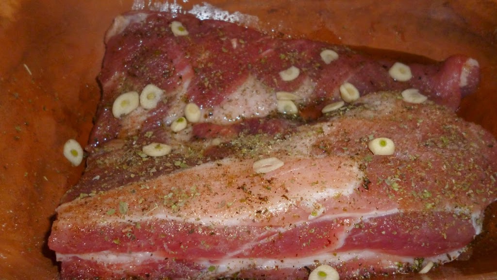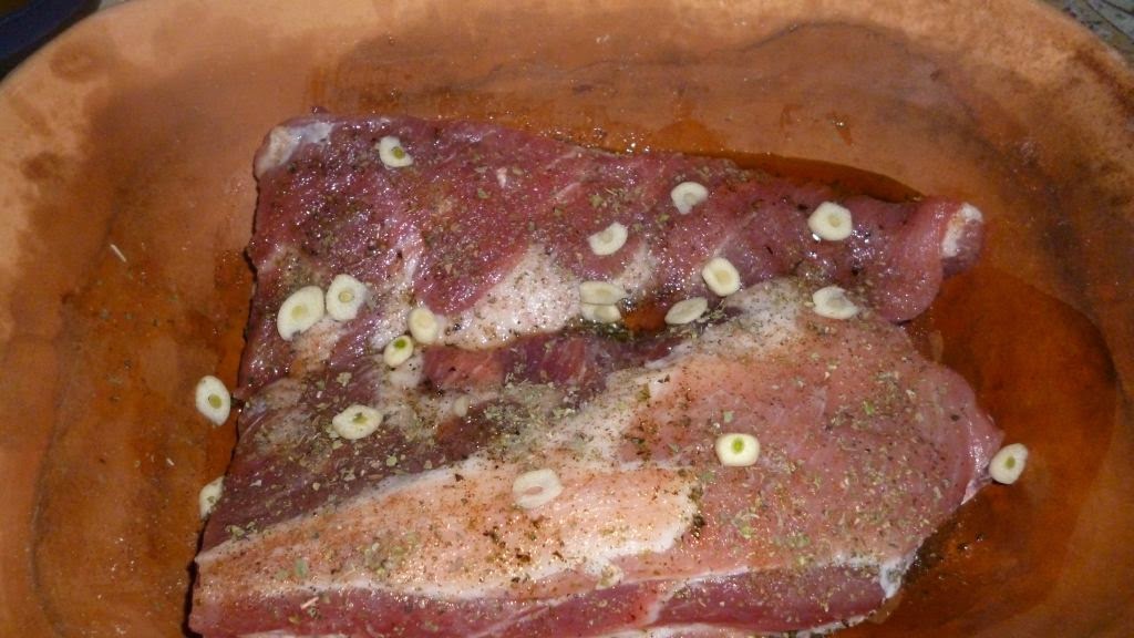 Miután beáztatódott a pataki tál, két evőkanál mangalicazsírt tettem az aljába, és ráfektettem a hűtőből kivett sózott-fűszerezett oldalast, amit előzőleg két részbe vágtam.