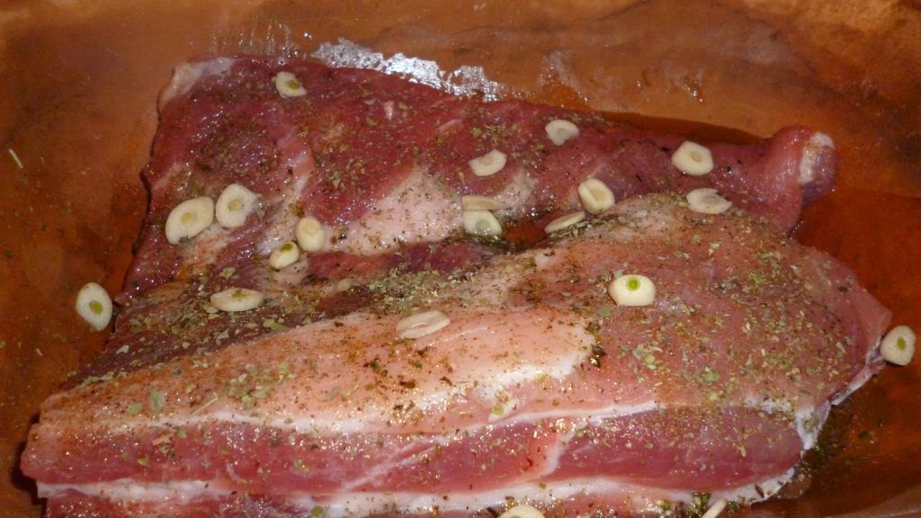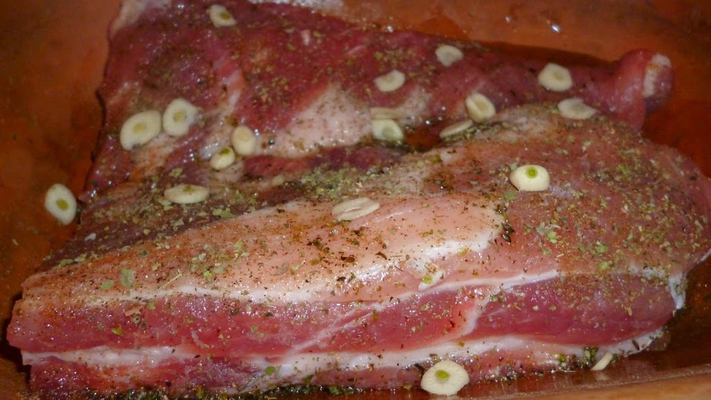 Az oldalast besóztam, majd a többi fűszerrel finoman áthintettem , hűtőbe tettem és állni hagytam körülbelül egy órán át. A pataki tálat beáztattam, tetejét és az alját is, bő fél órán keresztül.