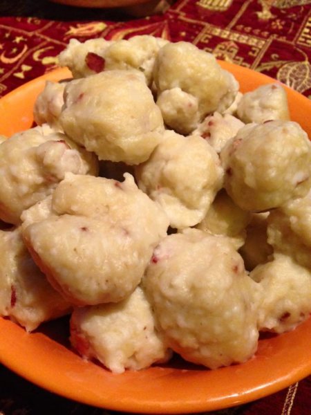 A burgonyákat meghámoztam majd kockáztam és puhára főztem. A baconszalonnát kockára vágtam és ropogósra sütöttem. Krumplinyomóval alaposan átnyomkodtam a megfőtt burgonyát és hagytam langyosra hűlni. Sóztam, majd folyamatos gyúrás közepette adagoltam hozzá a lisztet és a pirított baconszalonnát. Mikor már kézzel szépen formázható nem ragacsos és nem is kemény tésztát gyúrtam, egy nagy lábasban vizet forraltam és a tésztából gombócokat formázva kifőztem . Nem egyszerre főztem ki a gombócokat, mert a sok gombóc visszahűti a vizet és akkor ragadóssá válnak . Háromszorra főztem ki ezt az adagot. Mikor megfő, feljön a víz tetejére, ekkor kiszedtem, lecsepegtettem, zsírral vékonyan átkentem.