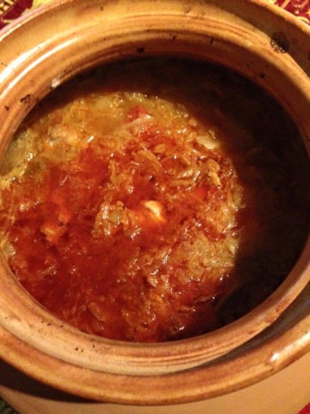 A darált húst összevegyítettem a fűszerekkel, sóval, tojással és a puhára főzött rizzsel. Alaposan kidolgoztam. A káposztát a cserépedénybe tettem, a húsos káposztához való pörköltalapból a tetejére mertem, majd felöntöttem vízzel . Betettem így a kemencébe majd kb fél óra elteltével a cserepet kivettem és a forró káposztához a darált hús masszából gombócokat formáztam . Ezután 40-45 percre visszatettem a kemencébe és készre főztem.