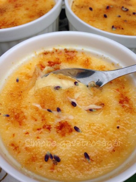 A kihűlt créme bruleék tetejét meghintjük kristálycukorral, majd konyhai lángszóróval aranyszínűre karamellizáljuk a cukrot. Megvárjuk míg kopogósra dermed a tetején a karamell majd kézbe vesszük és kiskanállal betörve a tetejét kikanalazzuk a selymes krémet . Én tálaláskor frissen szedett levendula szirommal meghintettem , csodás ízeket alkotott a krém és a levendula aromája.