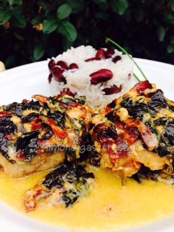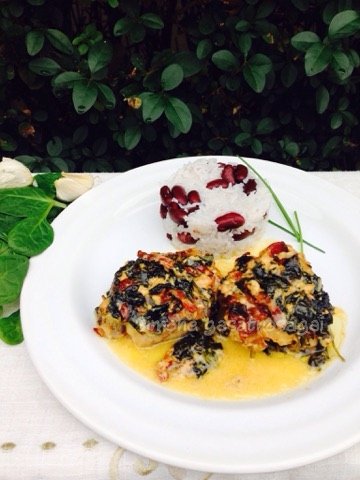 A csirkecombokat bőrösen és csontosan hagytam, sóztam borsoztam majd forró zsiradékban elősütöttem őket. A bőrén kicsit tovább hagytam sülni, kissé ropogósra aranyszínűre. Ezután kiszedtem és hagytam pihenni. A visszamaradt zsiradékban megpirítottam a baconszalonnát majd ráhalmoztam a parajleveleket és tejszínnel felöntöttem. Belereszeltem a fokhagymát, sóztam borssal meghintettem majd mikor a levelek szépen megfonnyadtak hozzákevertem a reszelt parmezánt. Ezt jól átforraltam. A csirkecombokat bőrös résszel felfelé egy jénai aljába sorakoztattam egymás mellé, a kész szósszal leöntöttem és lefedve puhára omlósra sütöttem. Babos rizzsel tálaltam.